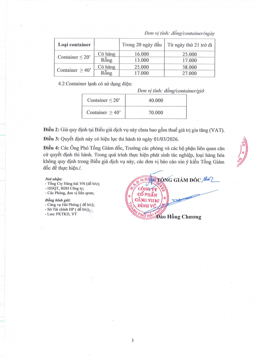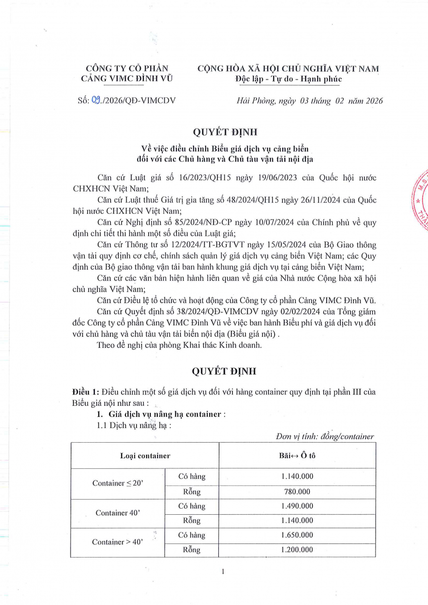 Thông báo "Quyết định v/v điều chỉnh Biểu giá dịch vụ cảng biển đối với các Chủ hàng và Chủ tàu vận tải nội địa" tại Cảng VIMC Đình Vũ có hiệu lực từ ngày 01/03/2026