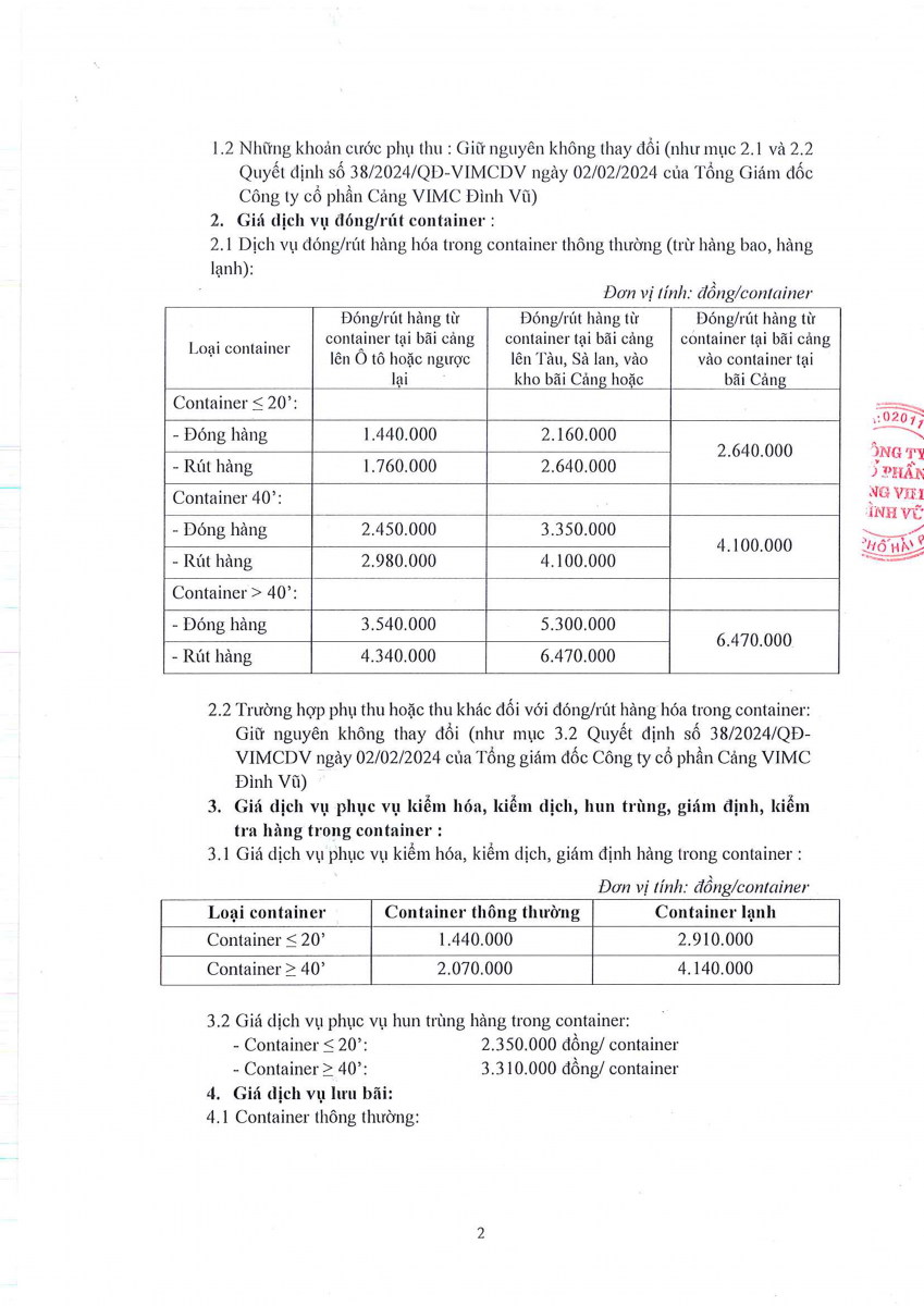 Thông báo Vv thực hiện giá dịch vụ cảng biển tại cảng VIMC Đình Vũ năm 2022